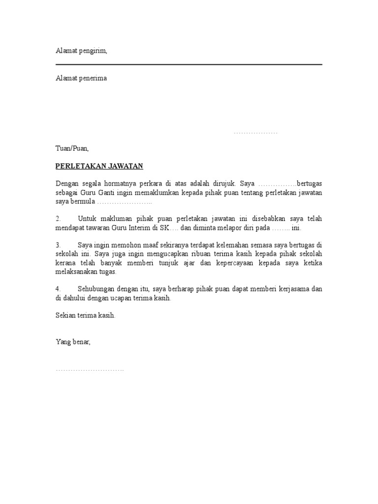 Contoh surat perletakan jawatan Notis 24 jam Berikut ialah contoh surat berhenti kerja kerana telah mendapat tawaran di tempat lain dengan notis 24 jam. Jika anda mendapat keputusan Band 3 tulis seperti berikut -KEPUTUSAN. Tawaran Diskaun RM 15 Untuk Pembelian Tiket ETS dan KTM Intercity.